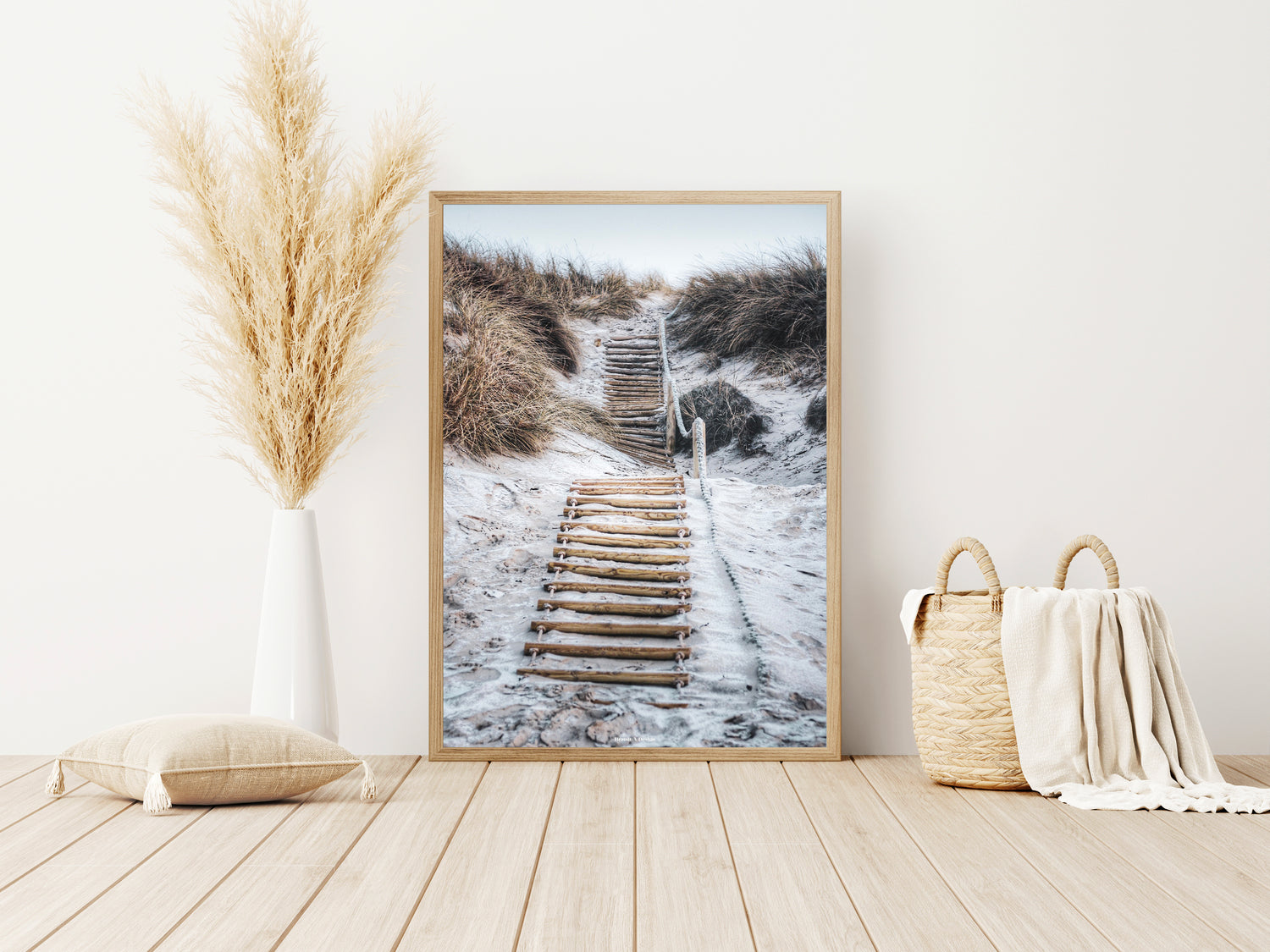 Gemt i klitternes sand langs vestkysten finder du Trappen i sandet . Skridt for skridt, trin for trin bringer du den smukke natur ind i hjemmet med denne unikke og flotte fotoplakat.
